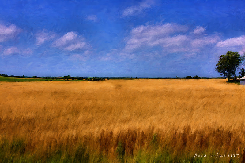 It got me thinking about the landscape in Kansas- somewhat hilly but "flatter than a pancake". Kansas is the 21st flattest state. North Dakota is the flattest. Anyway, I went online to look at paintings of Kansas and found so many gems, I just had to make a posting about it. Seems artists are infatuated by Kansas's landscape- flat as a pancake covered in sunflowers and farms...